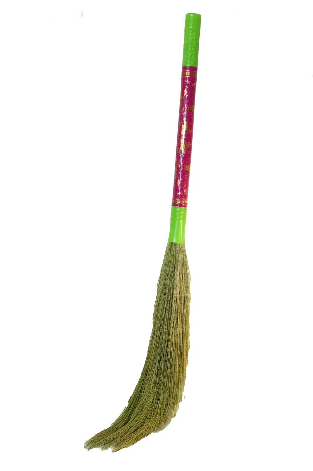 Lightweight coconut fiber broom for indoor sweeping.